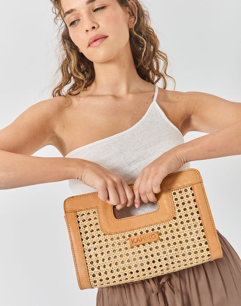 תיק קלאץ' בינוני עשוי מראטן בגוון טבעי, בעל ידית עור נוחה לנשיאה ביד. יקפיץ לך את הלוק בכל שעות היום!